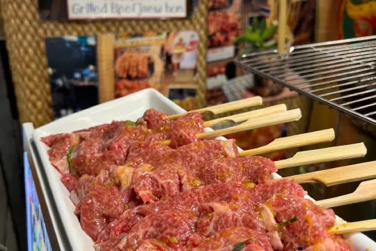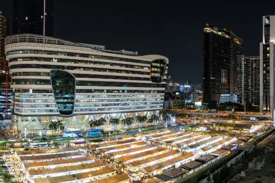 Neon lights glow above rows of stylish stalls, while the air is filled with the sizzling aroma of street food—from spicy Thai noodles and grilled seafood to quirky fusion bites and Instagram‑worthy desserts, Jodd Fairs Night Market is one of Bangkok’s trendiest night markets, blending street food, shopping, and nightlife in a modern, vibrant setting. (Opens at 5:00 PM until late night)