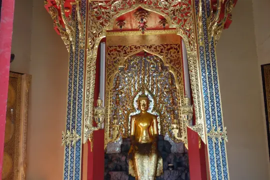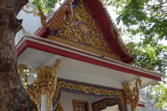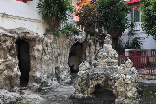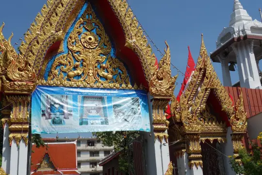 Wat Chakrawatrachawat Woramahawihan is a royal Buddhist temple in Bangkok. It was founded over 200 years ago, during the reign of King Rama I, and was later significantly reconstructed. The temple's largest structure is a massive Khmer-style tower. The main hall houses the revered Phra Nak Buddha statue, and the temple also features a small grotto with a "shadow of the Buddha", onto which visitors glue pieces of gold foil. The shrine is also known as the Crocodile Temple because of the pond containing several live crocodiles within its grounds. According to legend, the tradition began during the reign of Rama III, when a one-eyed man-eating crocodile was captured and placed in the temple under the protection of monks.