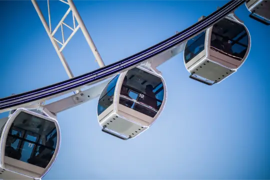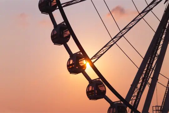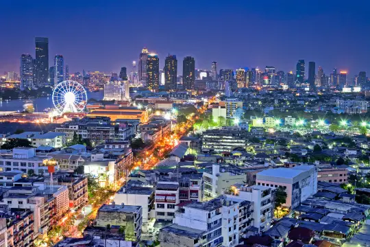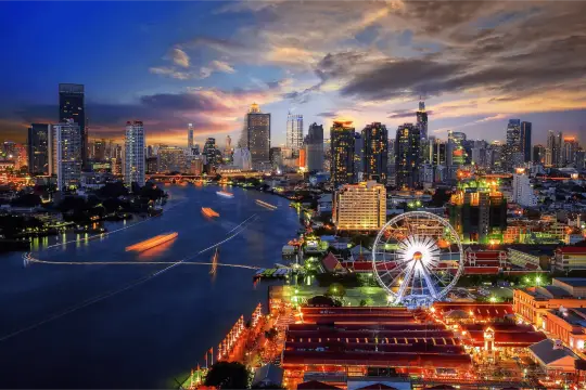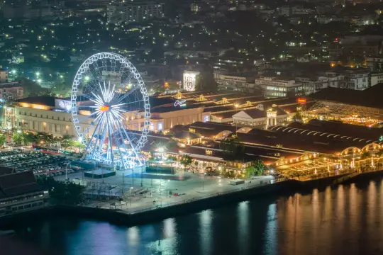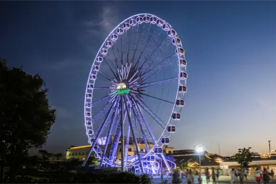 Located at Asiatique The Riverfront night market, Asiatique Sky is Bangkok’s largest Ferris wheel, providing panoramic views of the Chao Phraya River and the city skyline, especially stunning at sunset and night where the wheel is illuminated with changing colors, creating a vibrant backdrop to the riverside market.